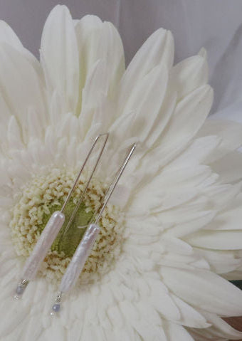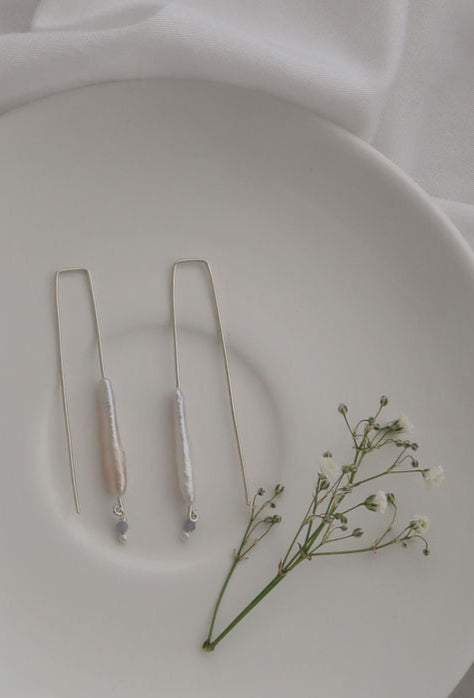 Aretes elaborados con plata mexicana .925, perlas cultivadas en río y tanzanita.