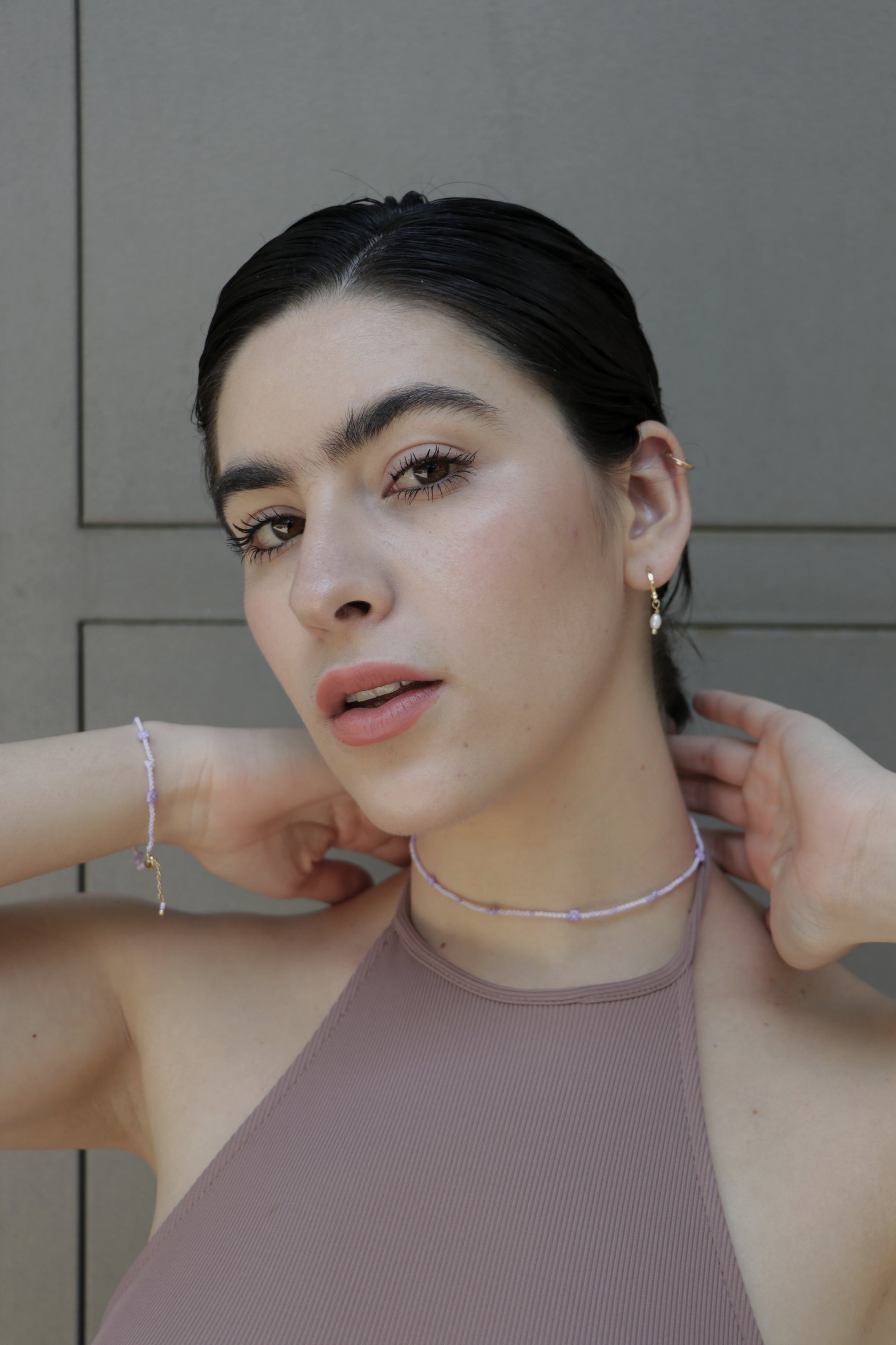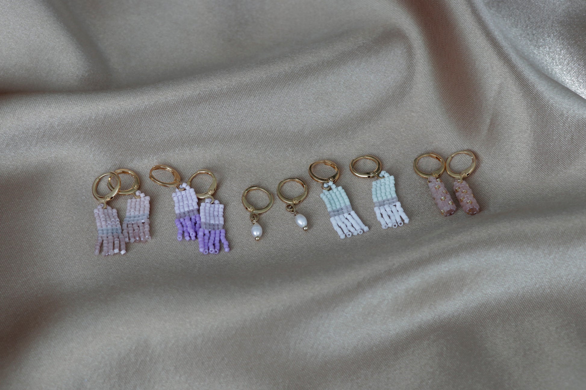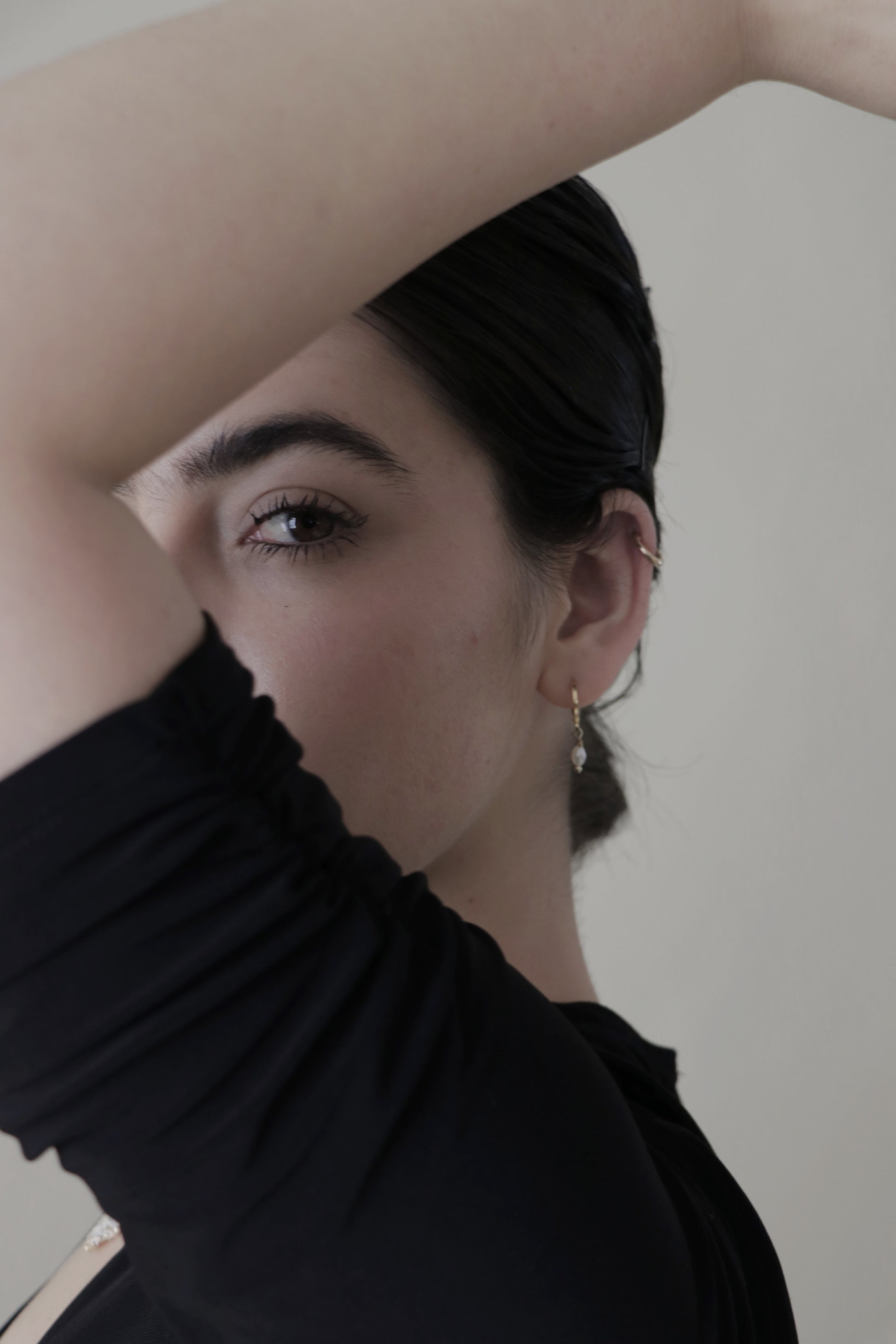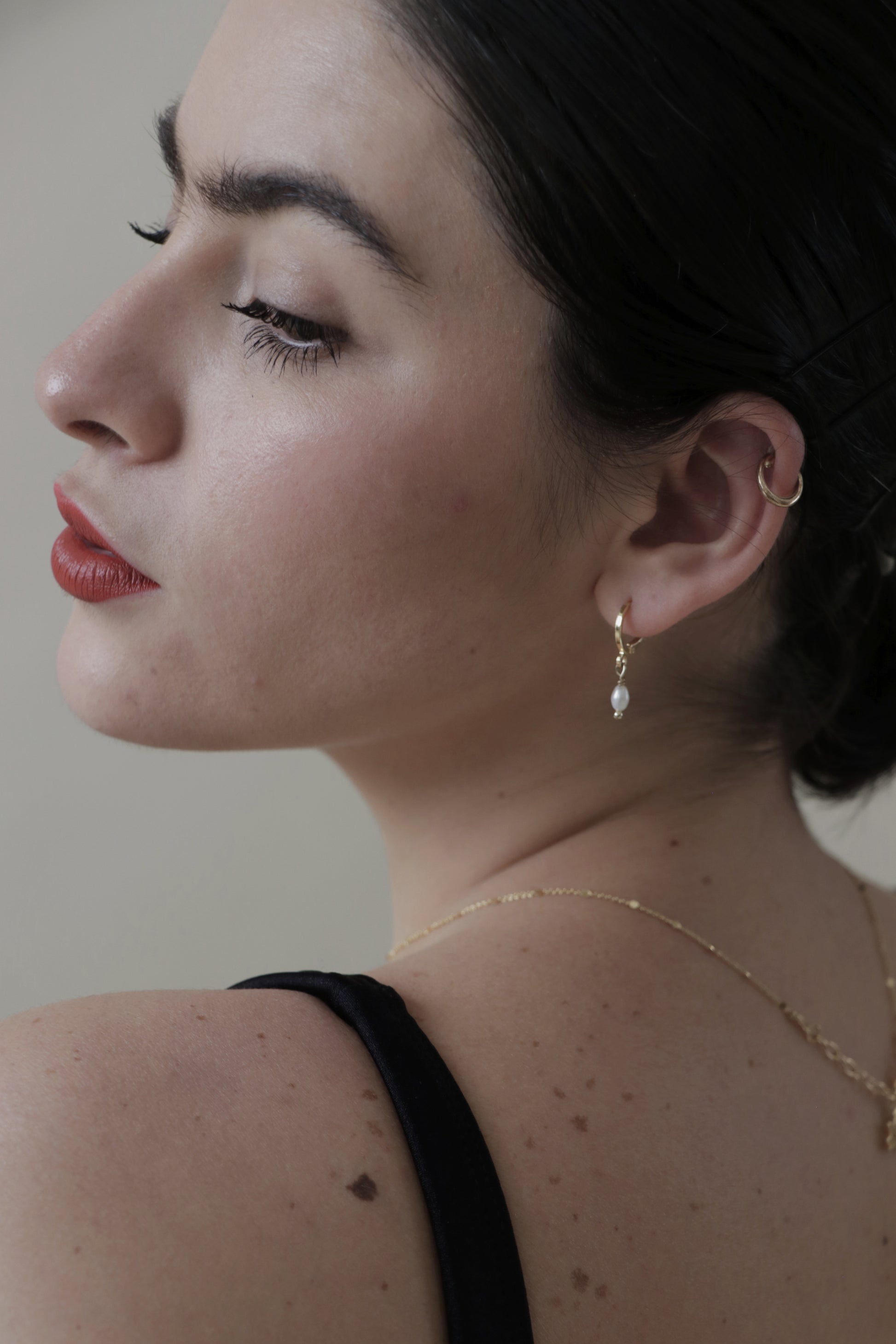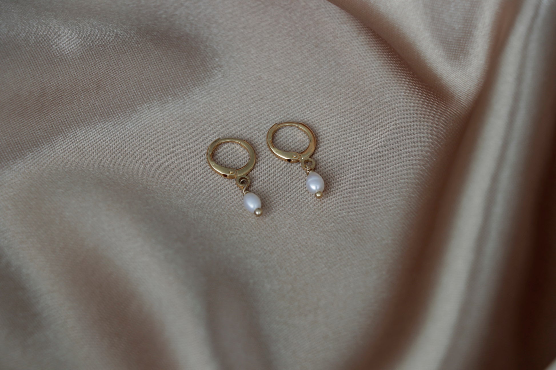 Aretes huggies con un pendiente de perla, hecho con perlas de arroz y aros y engarce de baño de oro de 14k.